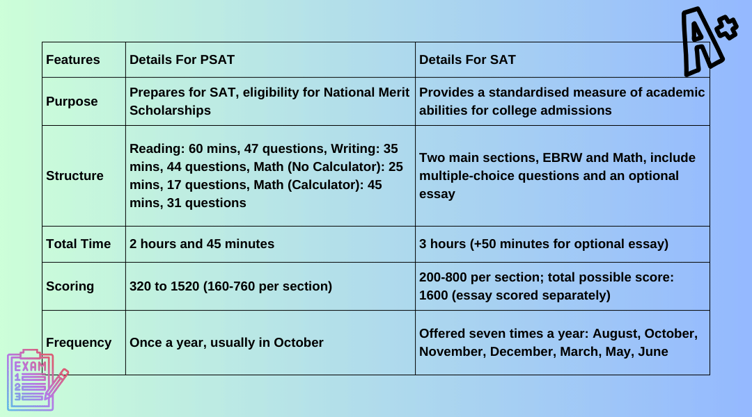 - Test Availability and Scheduling: The PSAT is usually administered once a year in October, while the SAT is offered multiple times throughout the school year, allowing students to take it as many times as they wish to improve their scores.