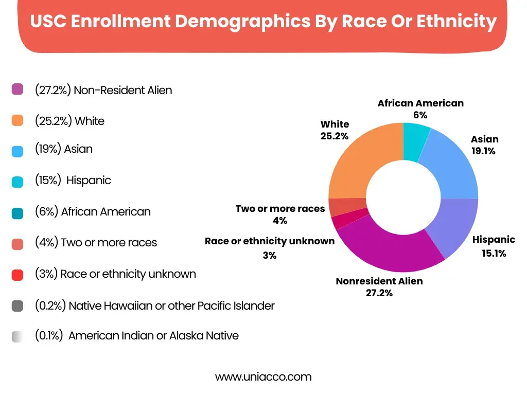 The acceptance rate of the University of Southern California (USC) stands at 12%, and is among the top 4% of the universities to get admission in the United States. This means that out of every 100 applicants, only about 12 are offered admission. The low acceptance rate highlights USC’s reputation for superior academic performance and competitiveness in admissions.